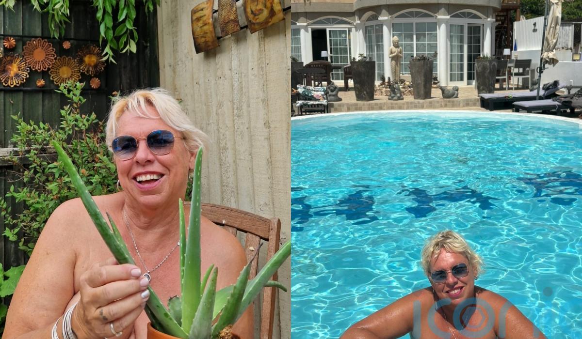 A divorcee who has been “naked for five years” has recently introduced live safety demonstrations at her naturist resort, showing guests how to “slather on aloe vera on their bits” to soothe sunburn.