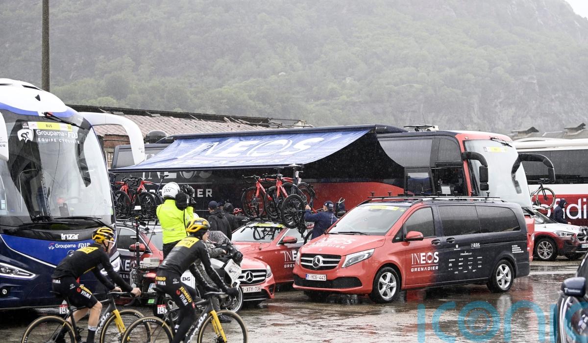 The stage started under heavy rain at Borgofranco d’Ivrea but organisers were forced to re-route some of it, with riders retreating to their team buses due to the conditions.