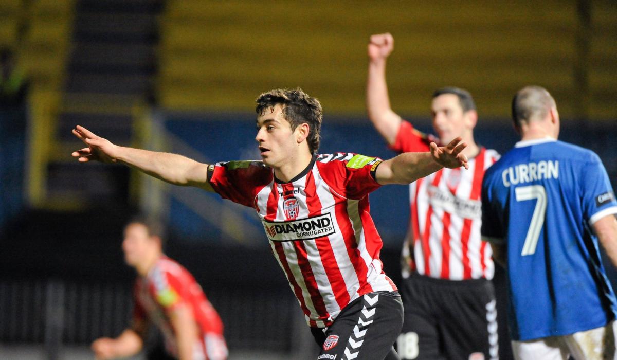 Davy McDaid celebrates Derry City's last goal at Windsor Park back in 2012.