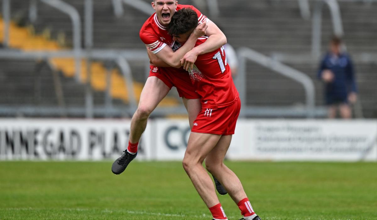 Eamon Young, left, and Dylan Rocks of Derry celebrate victory at the final whistle. Photo by Brendan Moran/Sportsfile