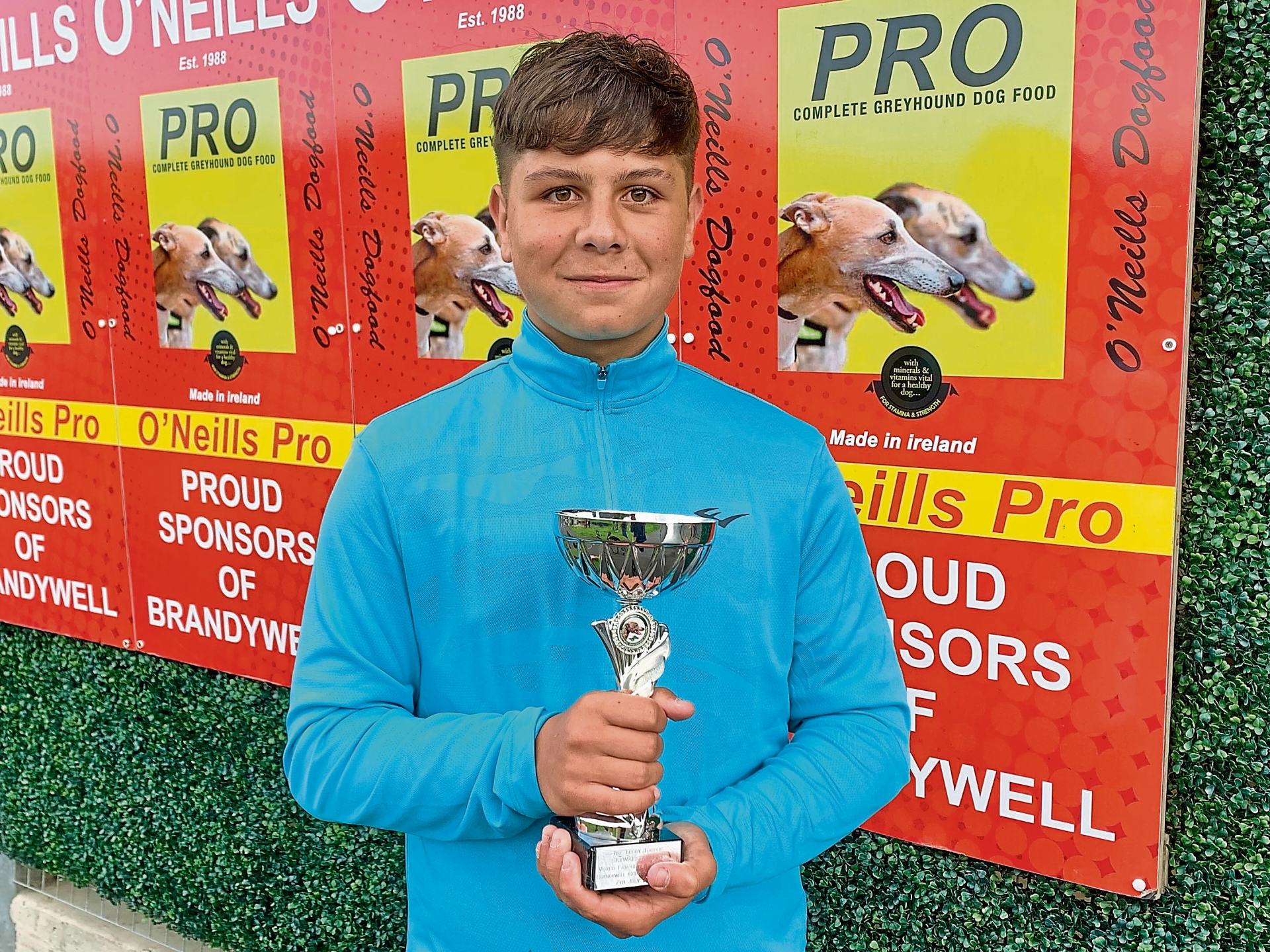 Brandywell; Shaun Rouse with the Teddy Trophy won by Skywalker Tina who was voted our favourite performer on 7/7/25. Trophy sponsored by Danny McGilloway.