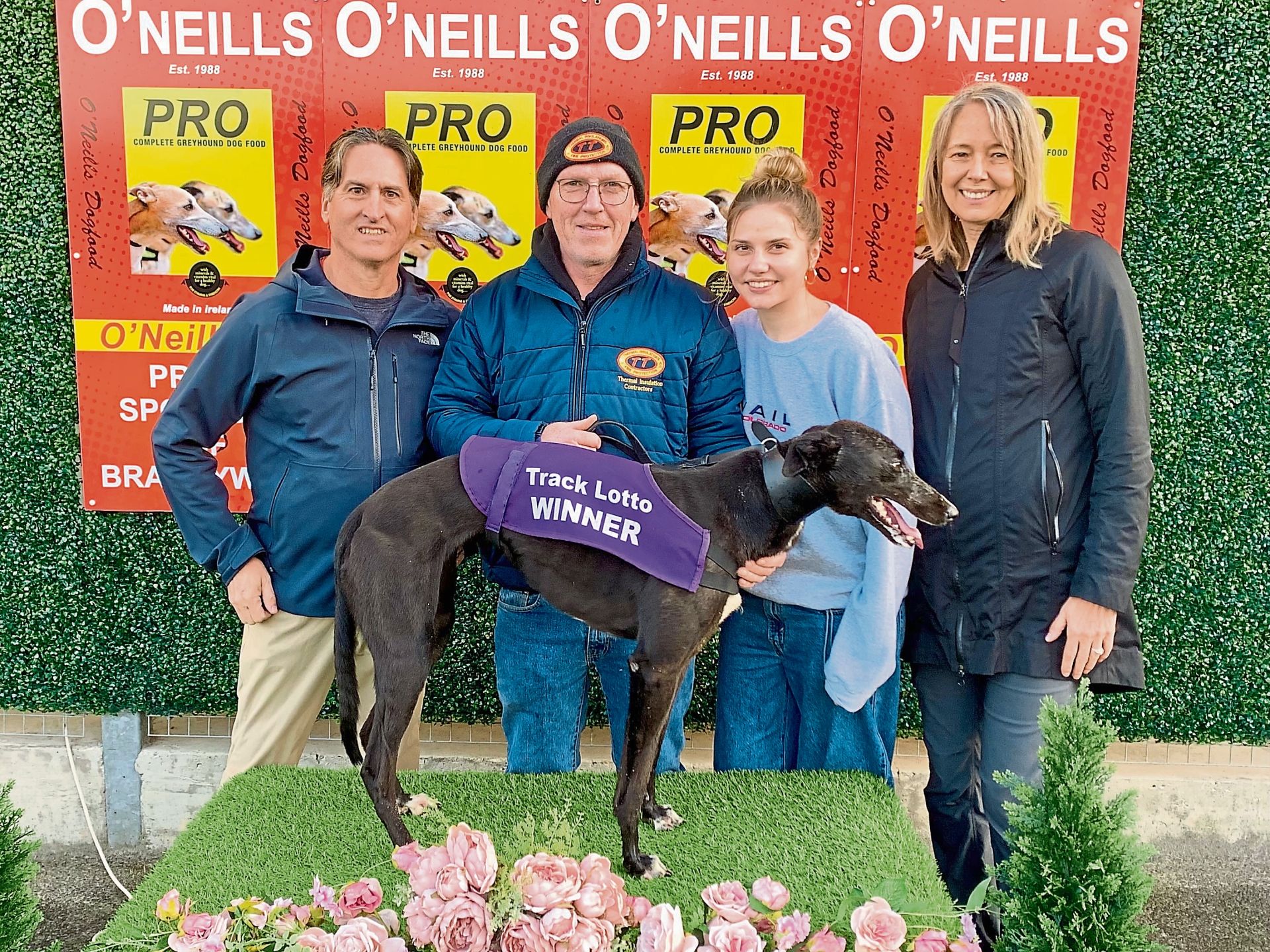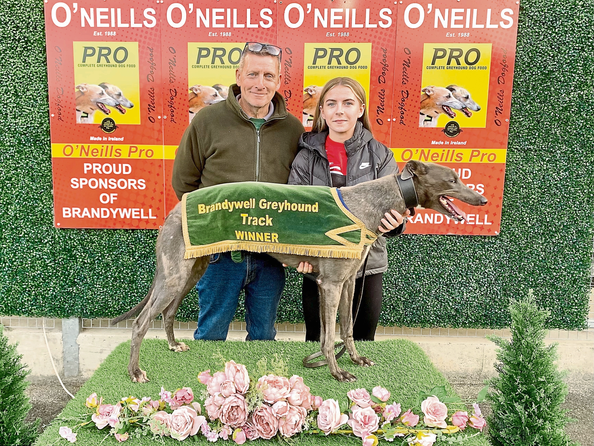 First to visit the winners’ podium was Ballyskeagh Nova (Ballymac Vic x Avongate Nova, Jun ’23) for owners Patrick Gibson and Paul O’Neill. Having only her second career start, Nova made full use of her trap 6 draw and kept a wide course throughout. Moderately away from boxes, she showed good pace to reach the first turn upsides the leaders where she ran a great bend to pull a few lengths clear.