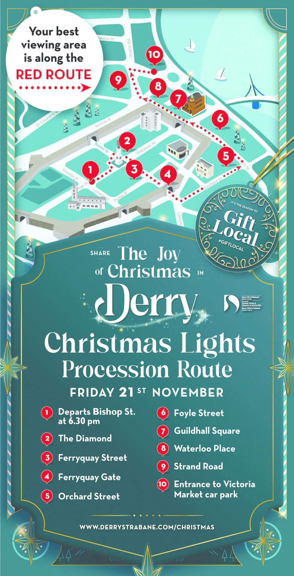 The full parade route is as follows: Bishop Street, The Diamond, Ferryquay Street, Ferryquay Gate, Orchard Street, Foyle Street, Guildhall Square, Waterloo Place, Strand Road, finishing at Victoria Market.
