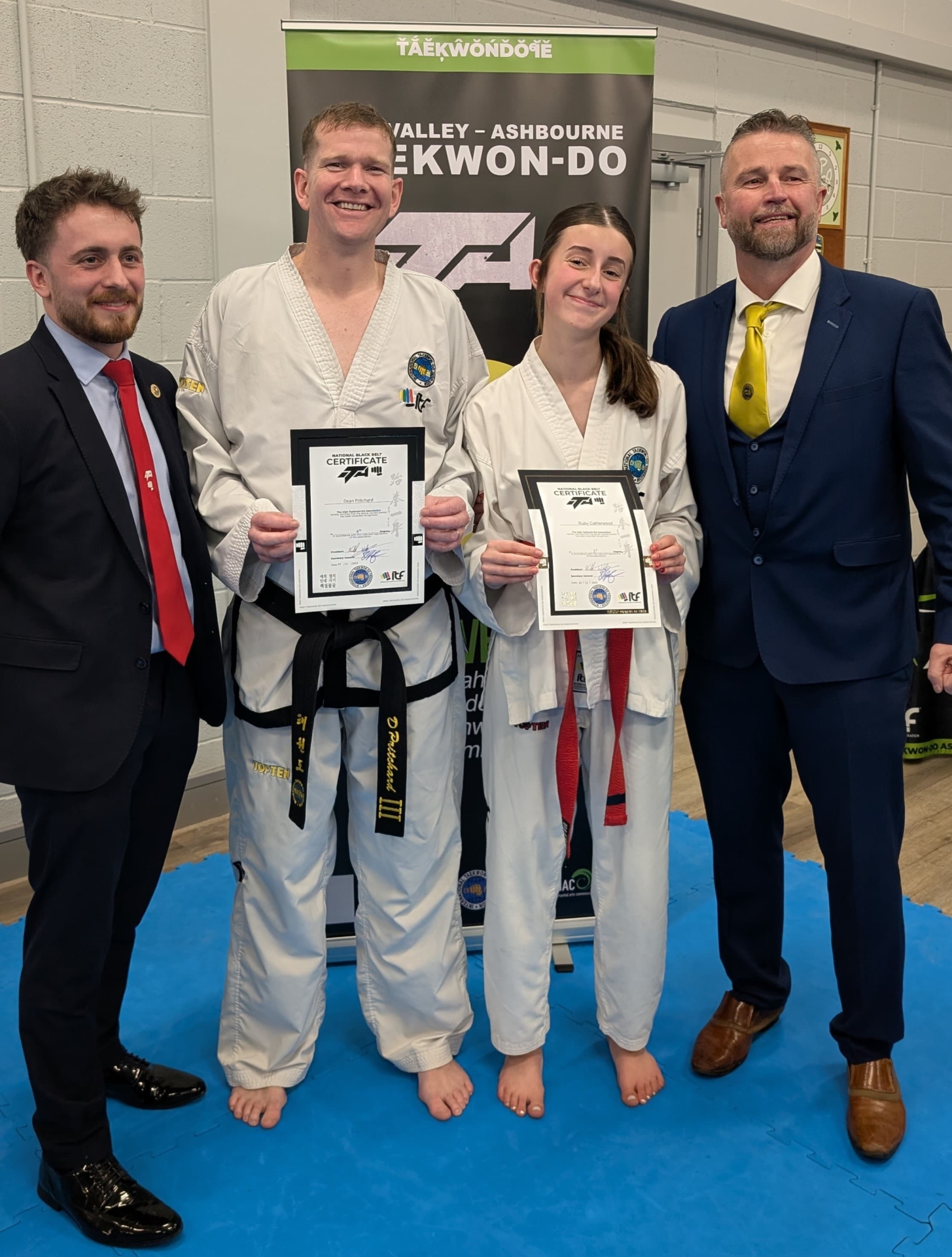ABOVE: Mr Karl Shaw 4th Degree, Mr Dean Pritchard 4th Degree, Ruby Catherwood 1st Degree, Master Stephen Cooley 7th Degree – Ruby and Dean receiving their awards at the ITA National Black Belt Grading, 7th December 2025.