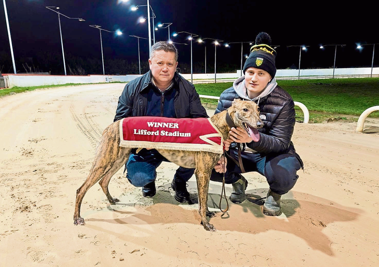 Lifford on Saturday; Race 7 - NWGOBA S1/S2 325 was won by GORTIN DAN in 17.64. Pictured with Niall McGhee & his son Darragh McGhee.