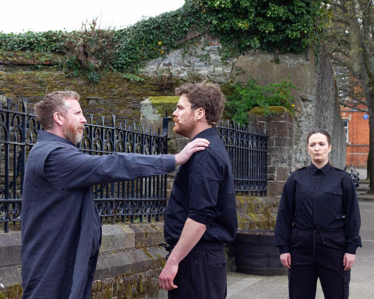 (L-R) Actors Stephen Bradley (as Jesus), Andrew Doherty (as The Guard) and Susie Garvey-Williams (as Internal Security Team) perform in last year’s Walled City Passion.