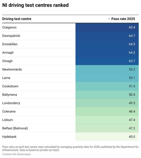 Craigavon had the highest pass rate for private cars out of all 15 test centres in the region in 2025, coming in at 65.4 per cent. This was followed closely by Downpatrick (64.7%) and Enniskillen (64.5%). At the other end of the scale, busier urban areas show markedly lower success rates, with fewer than half of candidates passing.