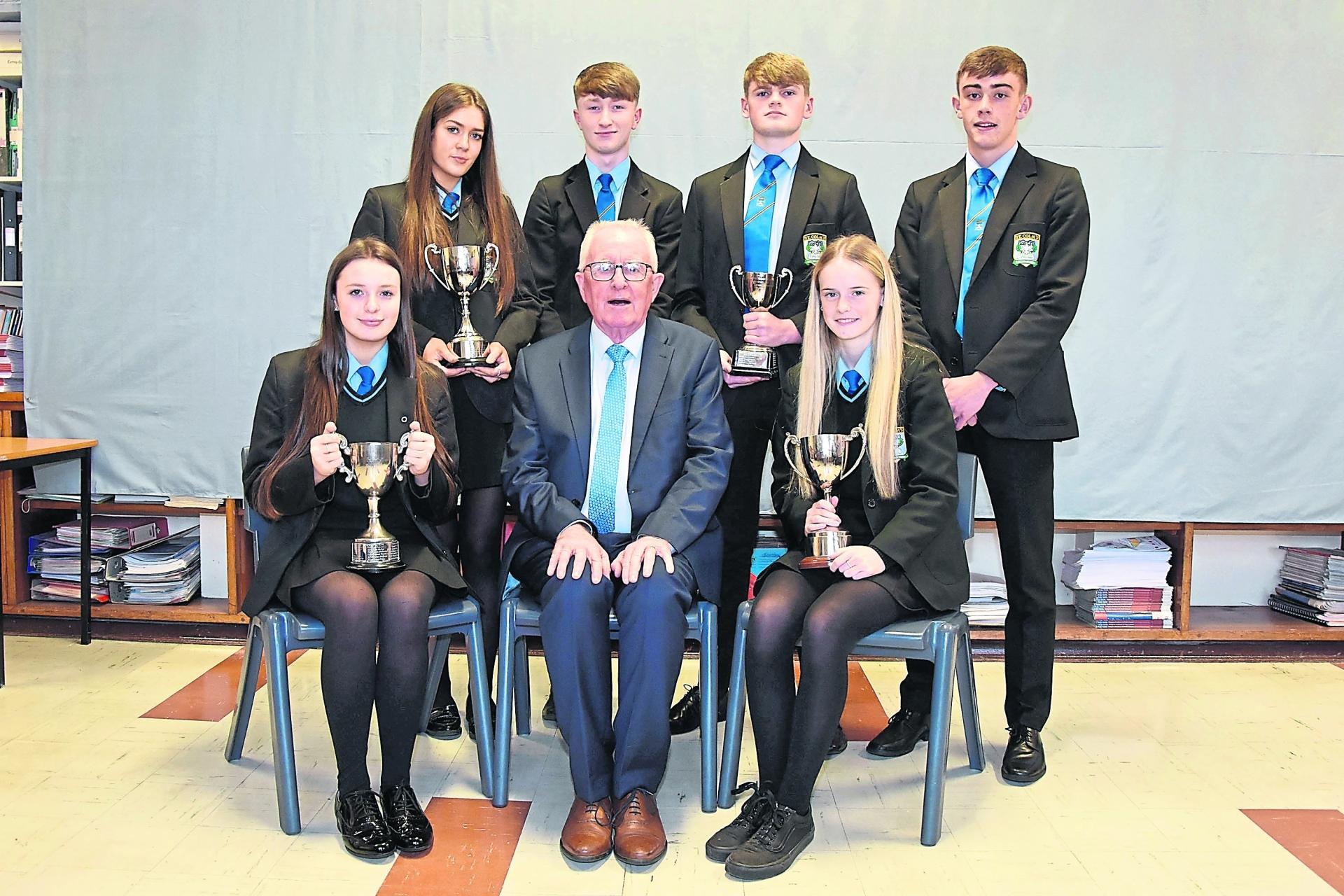 Groogan Cup), Shea O'Connor (The Heron Cup), Amy Lindsay (Seamus Kelly Cup), Gabriel O'Hagan (The Transport Cup), Mollie McAuley (The John Spillane Cup/The Lagan Cup) pictured at the Prizegiving at St Colm's High School, Draperstown.