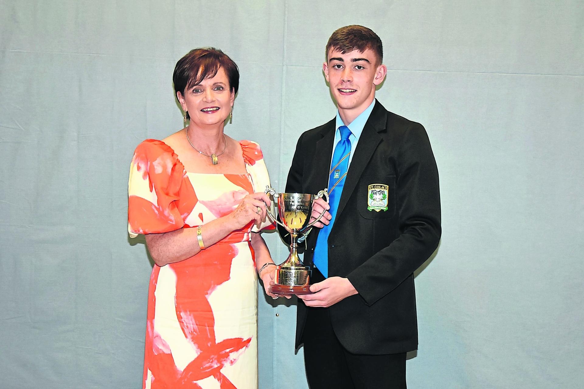 Mrs Roisin McKenna presents the Joe O'Kane cup to Ben O'Connor.