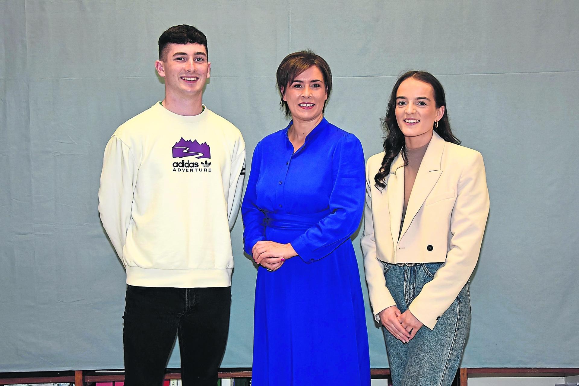 Head boy Ryan McElhennon and Head Girl Aoife Doyle with principal Ms. Sinead McAllister.