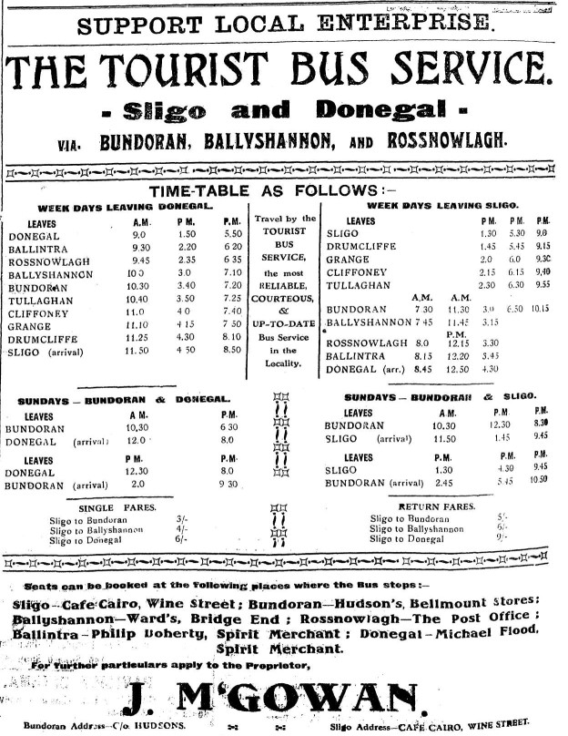 In 1927 and 1938 he came to Ballyshannon on election campaigns and addressed large crowds from a window of Mrs James McGonigle’s premises in Castle Street.