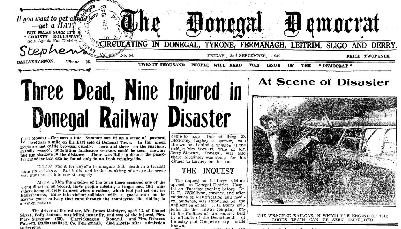 “The collision occurred at a blind turn on the railway as the train was emerging from a bridge on the main Donegal-Ballybofey Road,” said The Donegal Democrat, on September 2, 1949. “So great was the force of the impact that the train put the railcar back down the line for a distance of fifty yards, the engine bursting it into a twisted mass of wreckage.