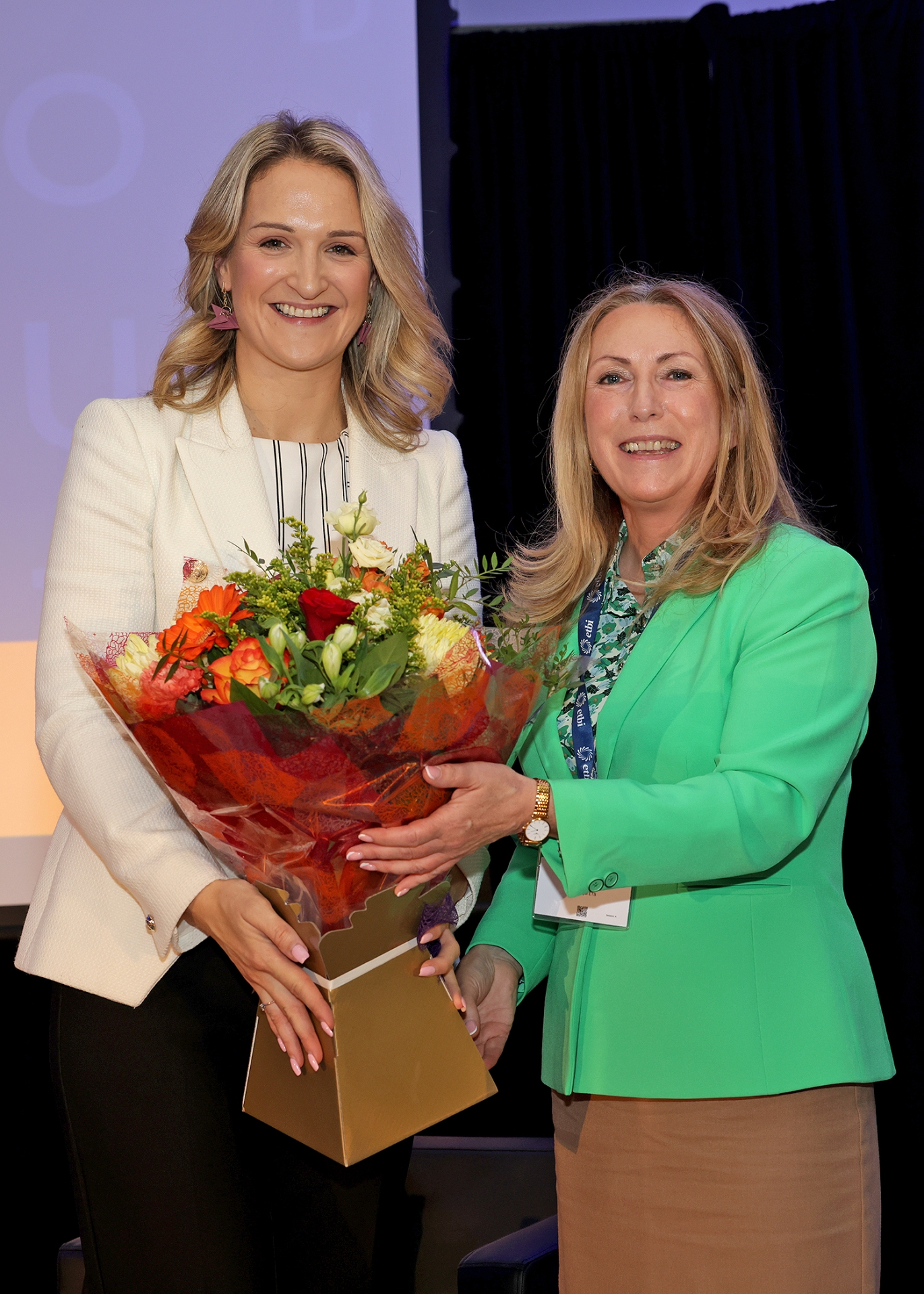 Chief Executive of Donegal ETB Anne McHugh presents bouquet to Minister Helen McEntee at ETBI Annual Congress 2025 held in Cavan