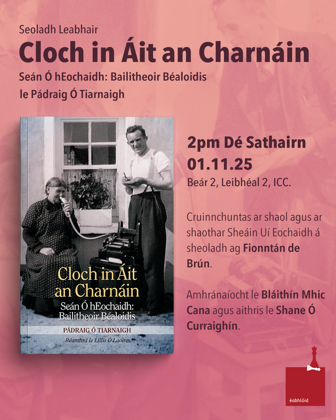 Beidh an leabhar úr: Cloch in Áit an Charnáin, a thugann cruinnchuntas ar shaol is ar shaothar an bhailitheoir béaloidis Seán Ó hEochaidh, á sheoladh ag Éabhlóid in ICC Bhéal Feirste, Dé Sathairn, 1 Samhain.