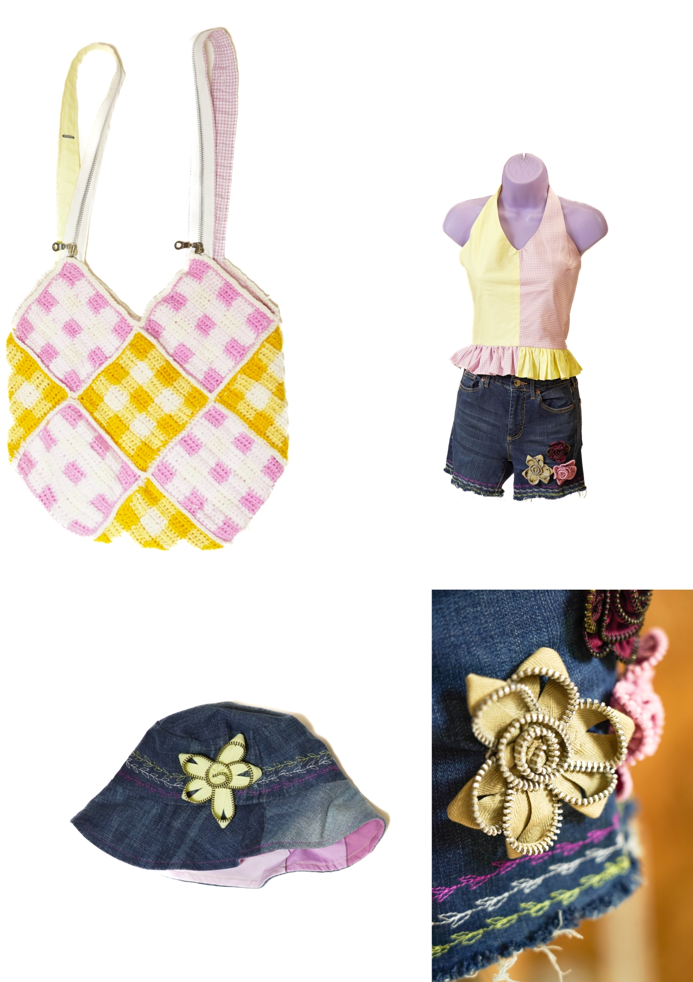 Cara also crocheted a matching bag from leftover wool, lining it with one of the shirts and using the button plackets as straps. Zips sewn along the outside added a distinctive design feature that tied the ensemble together. To complete the look, she made a reversible bucket hat from the jeans’ legs and an old pillowcase, embellishing it with decorative leaf stitching and another detachable zip flower. Even the final accessory, a coordinating scrunchie, was made from leftover fabric, ensuring nothing went to waste.