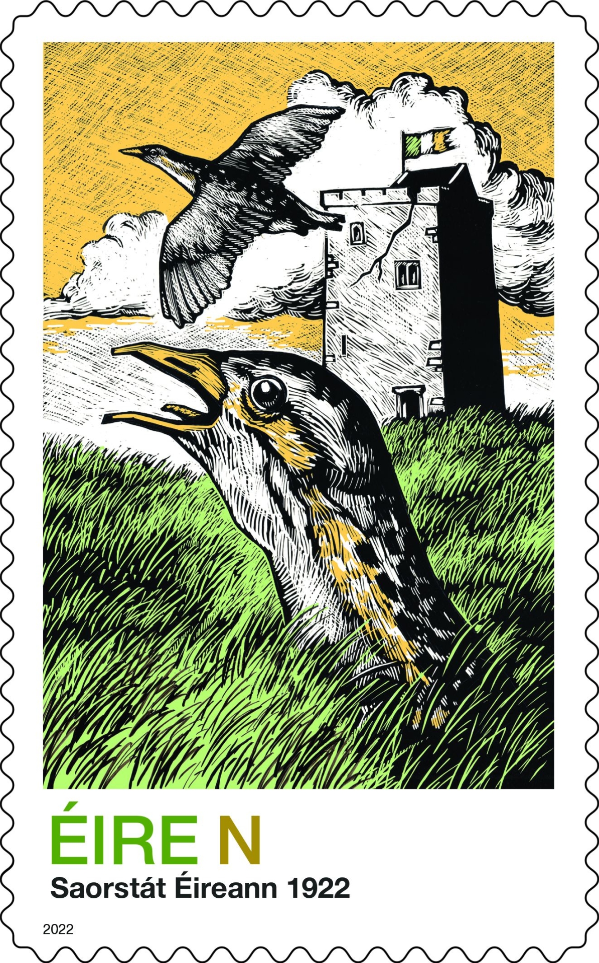 The historic stamp shows a fortified tower house with a crack and two corncrakes emerging from a meadow. Brian became familiar with the Corncrake, an ‘endangered species’ during his time in Donegal: “I would have heard the Corncrake in Donegal. The tower in the background signifies conflict, colonisation, I suppose, and with the crack in it is to signify a split and the treaty being a split and the partition of Ireland being a split. It symbolises division and all of that,” he said.