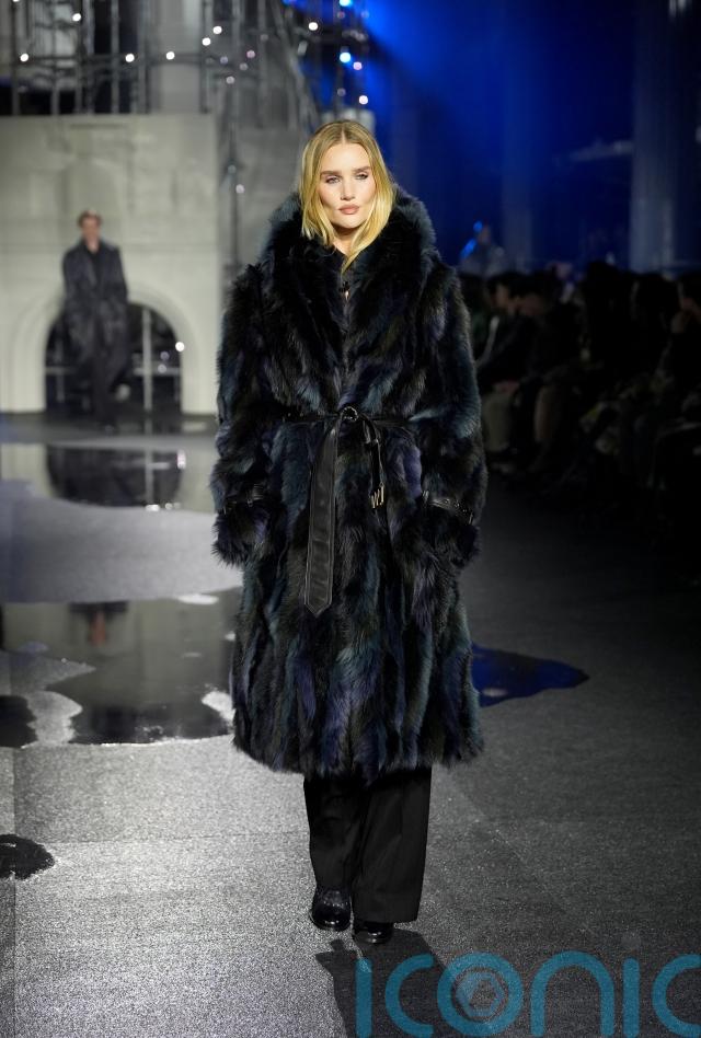 Huntington-Whiteley, 38, wore an extravagant knee-length black fur coat with navy highlights, tied at the waist with a leather-look black cord.