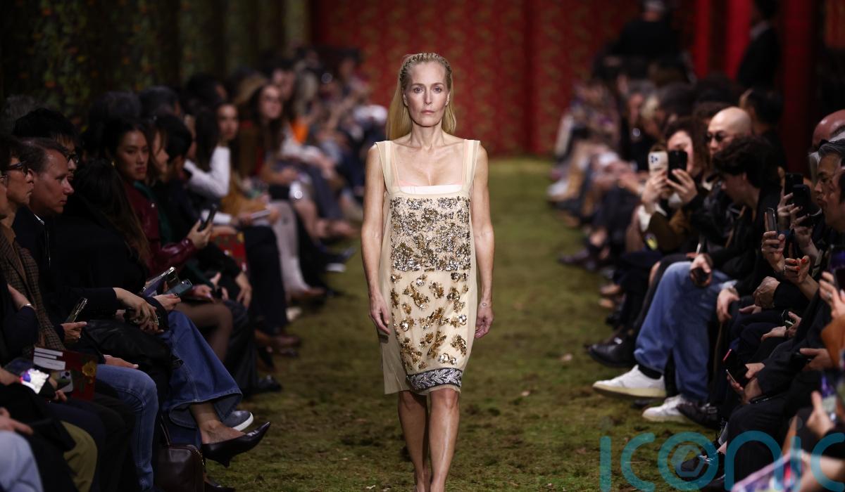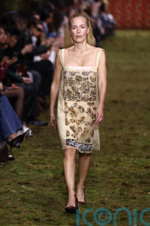 The 57-year-old actress, known for The X Files and for playing sex therapist Jean Milburn in Netflix’s Sex Education, took part in the luxury Italian fashion brand’s show on Tuesday afternoon.