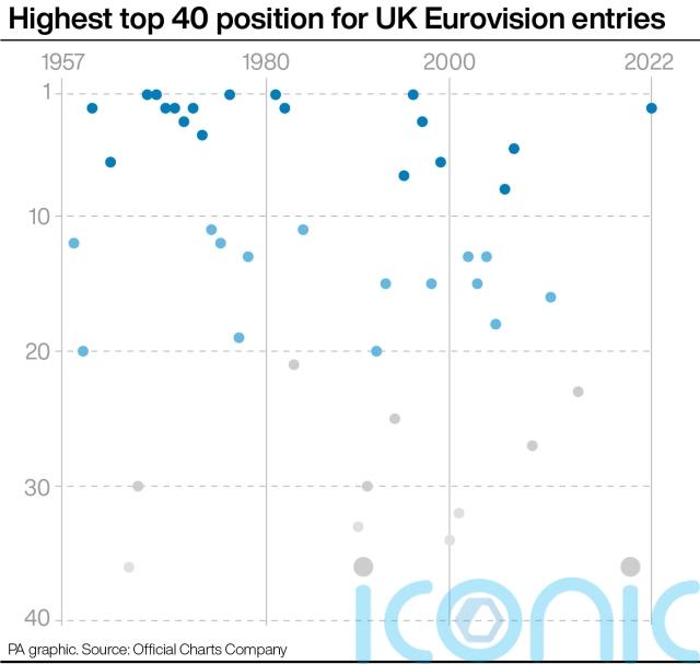 Overall, out of the UK’s 65 Eurovision entries since 1957, just over two-thirds – 44 – have managed to get into the top 40.