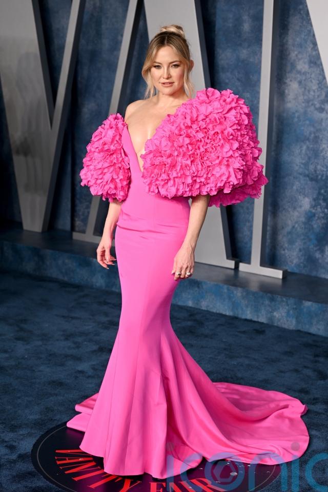 Changing out of the silver sequinned Rodarte dress she wore to the Oscars ceremony, Kate Hudson chose a bright pink gown for the Vanity Fair party.