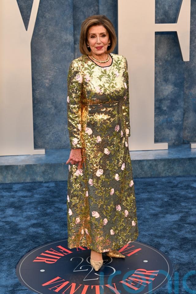 American politician Nancy Pelosi wore a gold sequinned Giambattista Valli gown with pale pink flowers dotted on.