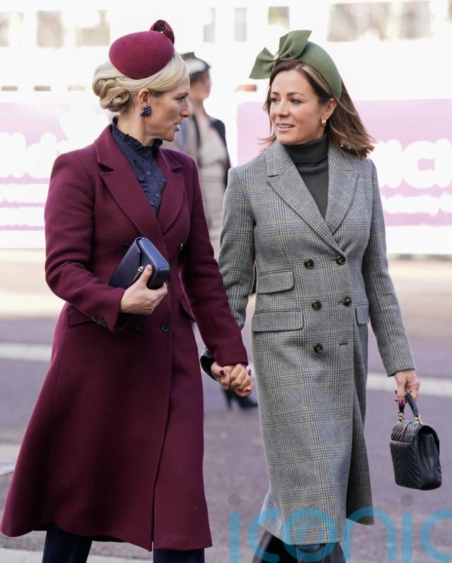 Daughter of the Princess Royal, Zara Tindall donned a maroon coat and hat with a navy blouse, trousers and handbag on day one.