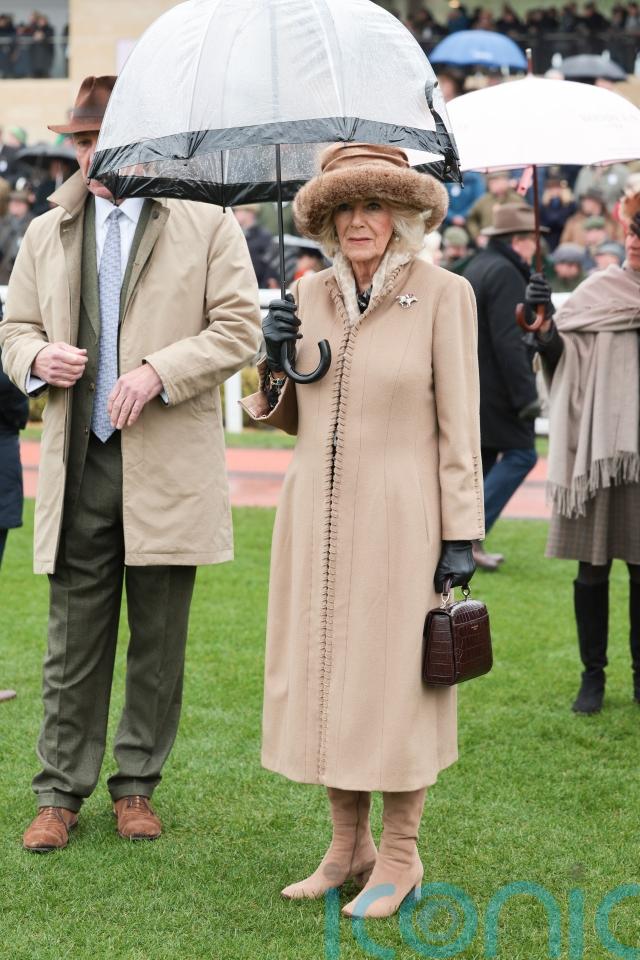 Presenting trophies to winning jockeys on Ladies Day, the Queen Consort chose a classic camel coat and matching suede boots for the occasion.