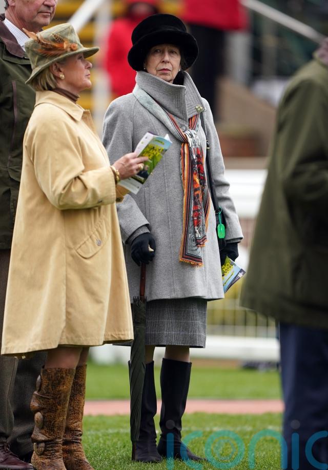 Joining daughter Zara, the Princess Royal was bundled up in a grey trapeze coat, tweed skirt and suede boots with a furry black hat and a colourful scarf tied around her collar.
