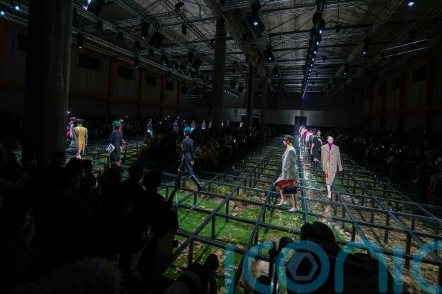 In a cavernous black room, the runway was raised and see-through, revealing lush greenery underneath – grass, shrubs, leaves and more. Prada said the set ‘reflects the contradiction between our indoor existence and our innate connection to the outdoors’.