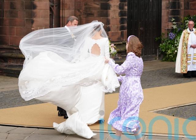 She walked into the cathedral with the groom’s three sisters, Lady Tamara Grosvenor, Lady Viola Grosvenor and Lady Edwina Grosvenor.