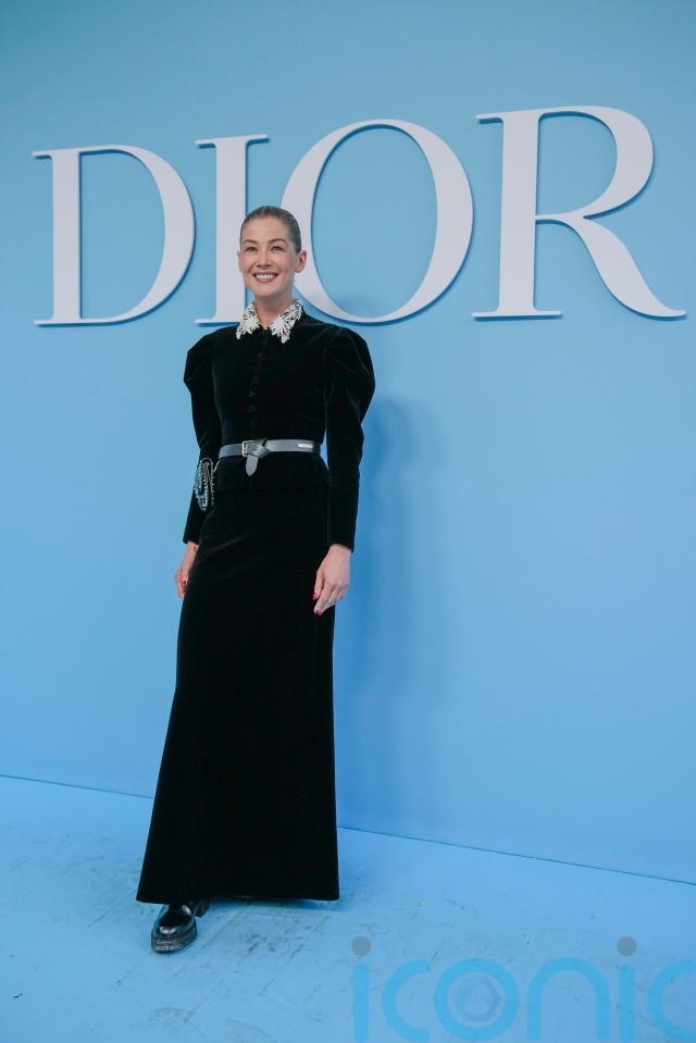 Rosamund Pike, 45, wore a velvet black evening gown with Edwardian button detailing, puffed sleeves and a tied leather belt.
