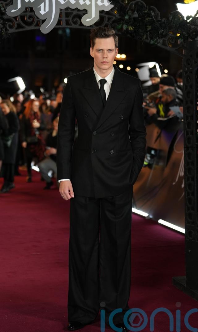 Swedish actor Bill Skarsgård, 34, known for his role in Stephen King’s IT, also sported a monochrome look in a black Seventies-style double-breasted suit with an exaggerated flare.