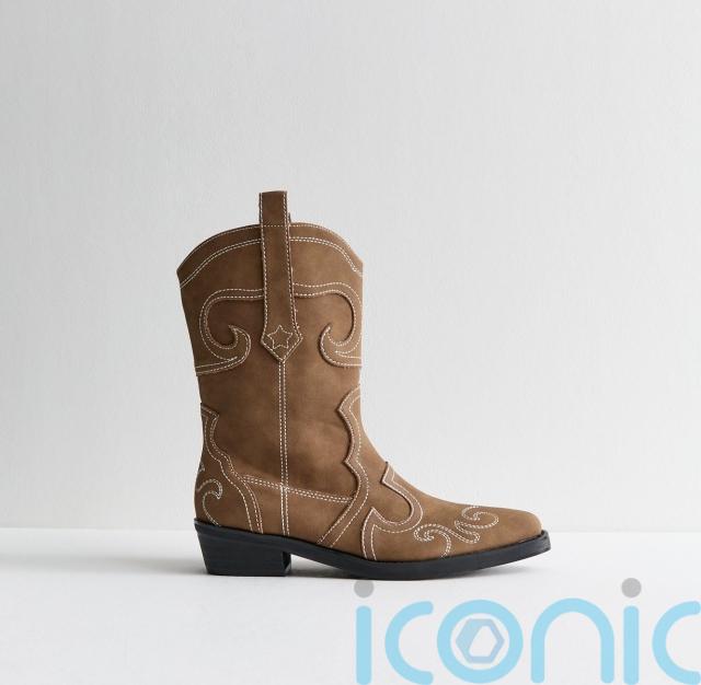 Public Desire Brown Folklore Faux Suede Contrast Stitch Boots, £49.99, New Look