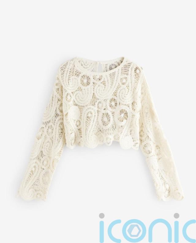 Next Ecru Cream Long Sleeve Boho Crochet Cropped Top, £40
