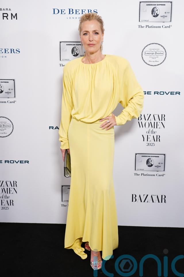 Actress Gillian Anderson stepped out in a butter yellow gown by Stella McCartney with ruched sleeves and shoulder pads.