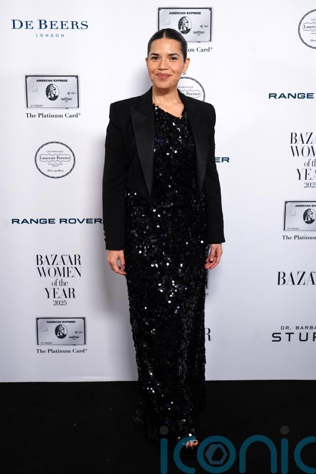 Barbie star America Ferrera, 41, also sported black sequins in an asymmetrical column gown with a silk lapelled blazer.