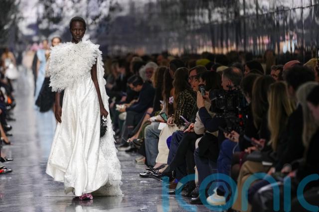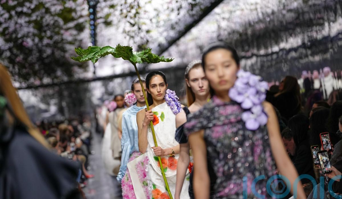 The closing looks featured sky-blue silk gowns emblazoned with flowers, demonstrating restraint in tone but not in tailoring. The bridal dress – silk and chiffon, backless, with feathers fluttering down the bodice and into a pluming skirt – was both romantic and otherworldly, as if grown rather than made.