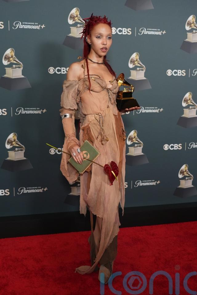 FKA Twigs, 38, sported the neutral nude trend in a custom Paolo Carzana dress. She accessorised her look with metallic, vine embellishments, sky-high platform heels wrapped in tights, a book and a red peace lily.