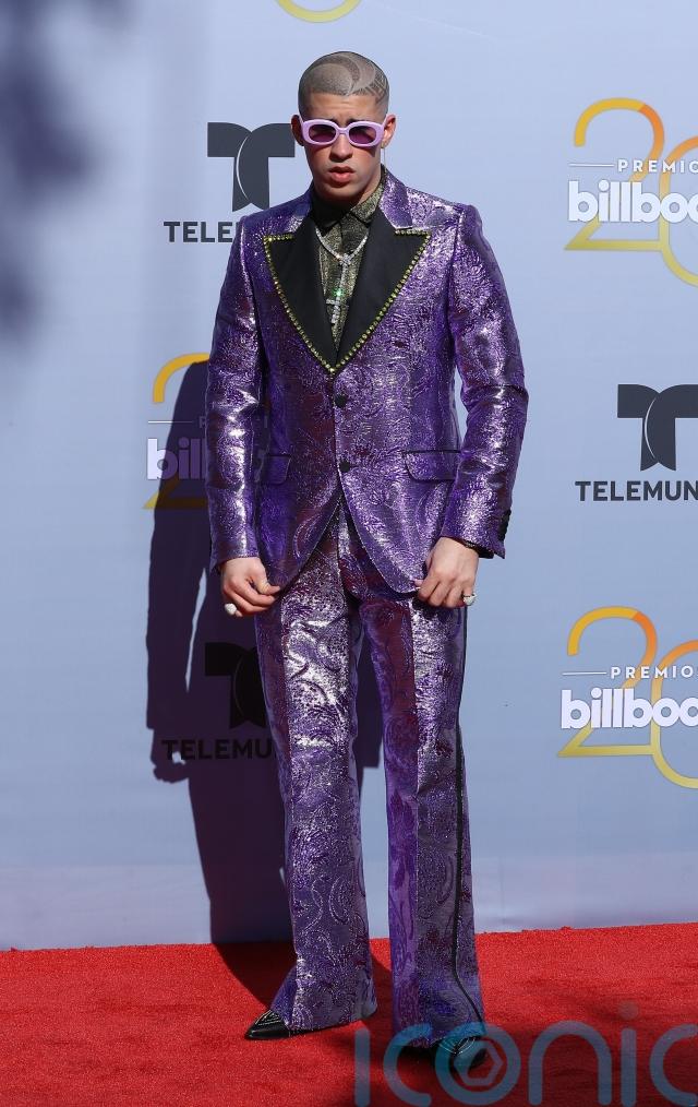 The following year at the same awards ceremony, Bad Bunny retained his colour palette of green and purple but reworked the idea of a red-carpet suit entirely.