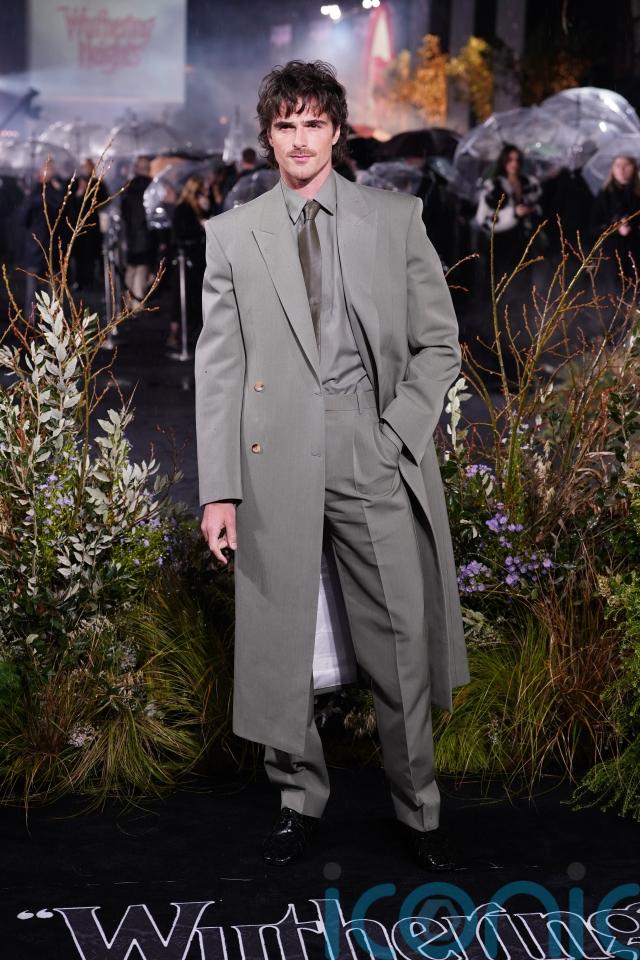 Jacob Elordi, 28, who plays Heathcliff in the film, stepped out in a monochromatic, slate grey suit with a leather tie and a double breasted overcoat.