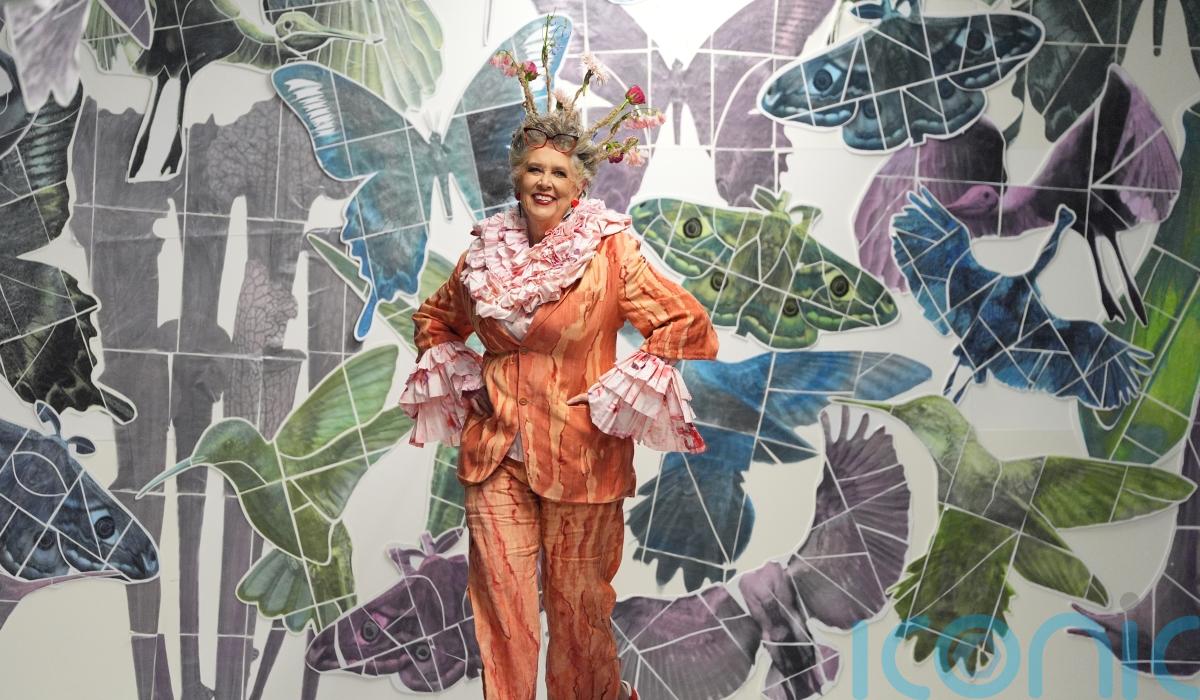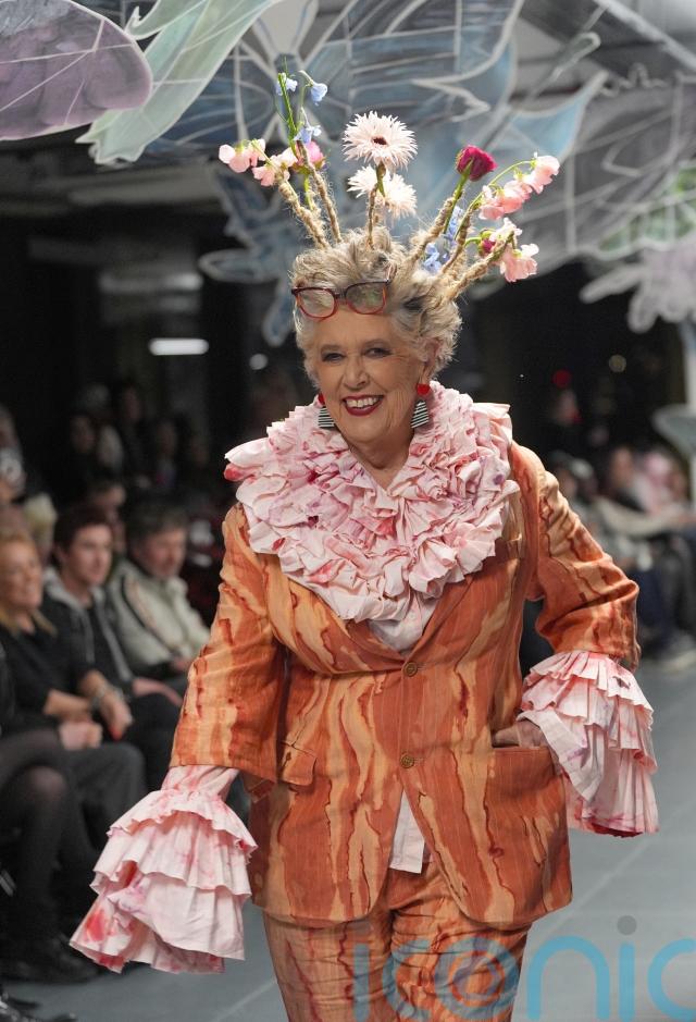 The broadcaster and restaurateur walked the runway in a pink ruffled shirt and orange suit, with a floral headpiece for the design duo’s latest eco-collection, JORD – the day before her 86th birthday – in a show that also marks a new collaboration with the British Heart Foundation (BHF).