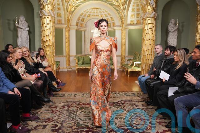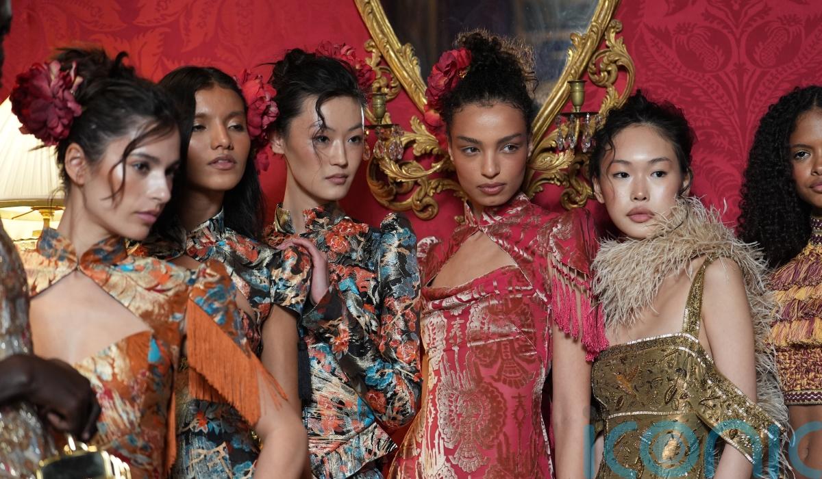 Texture played a central role. Tapestry-style florals in burnished orange, teal and gold were cut into high-necked dresses with sculpted shoulders, while metallic threads caught the light as the models turned.