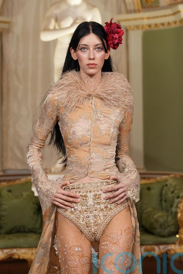 At Spencer House, that philosophy manifested in garments that felt considered despite their exuberance. Intricate hand-beading, carefully placed applique and densely worked embroidery spoke to hours of labour behind the scenes. Even the most theatrical pieces – from feathered capes to heavily embellished corsetry – retained a sense of precision.