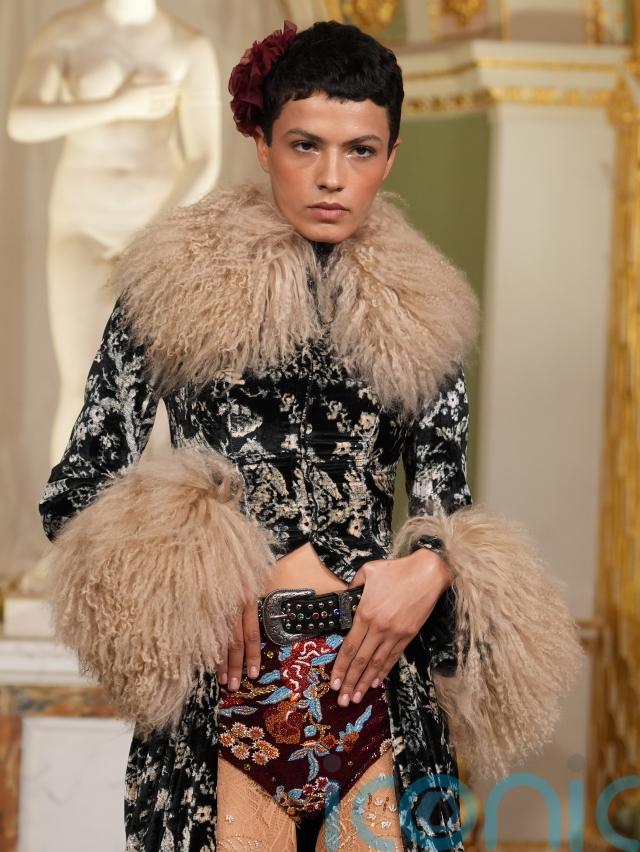 Another ensemble featured a cropped black velvet jacket with oversized shearling-style sleeves, worn over intricately embroidered briefs and lace tights – a juxtaposition of softness and structure.
