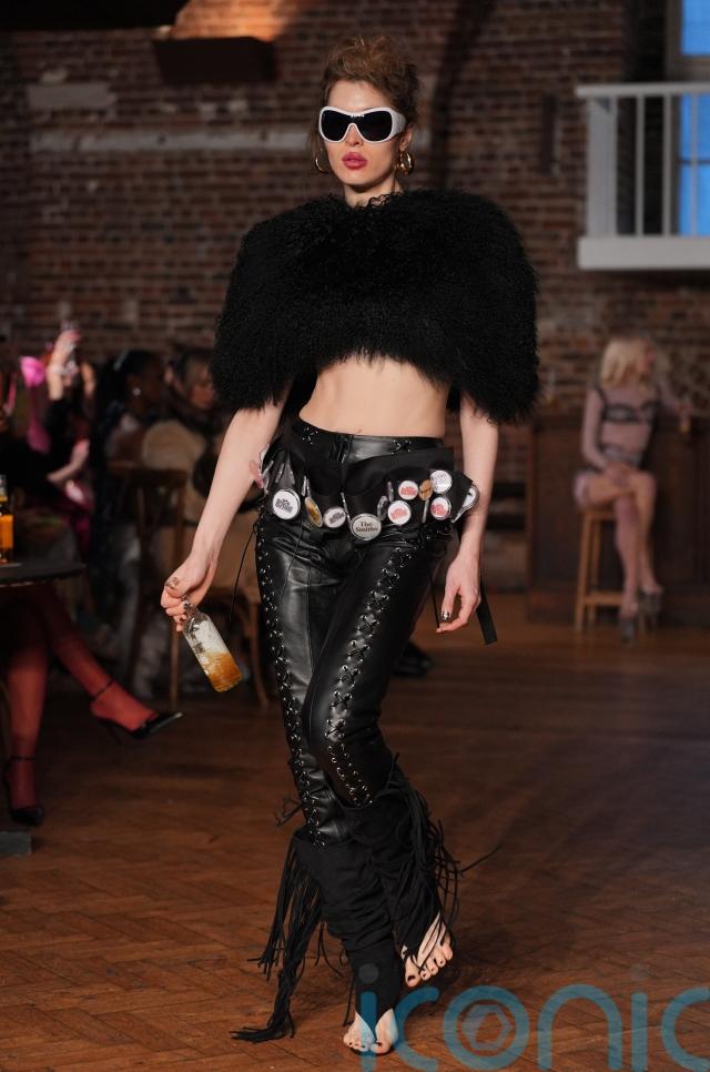 A visible collaboration with Desperados ran throughout the show, with bottle caps repurposed into jewellery and hardware details. One model wore a belt designed to hold bottles, while another used a buckle-turned-bottle opener on the runway. At times the branding felt overt, but it aligned with Gorey’s unapologetically playful, irreverent aesthetic.