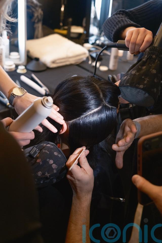 Backstage, teams worked methodically, sectioning hair with surgical precision. Fine-tooth combs carved out razor-sharp centre partings while straighteners glided over each panel until it reflected the light. The finish was like liquid – no bend, no fluff, no excess movement.