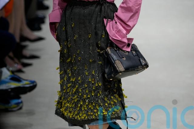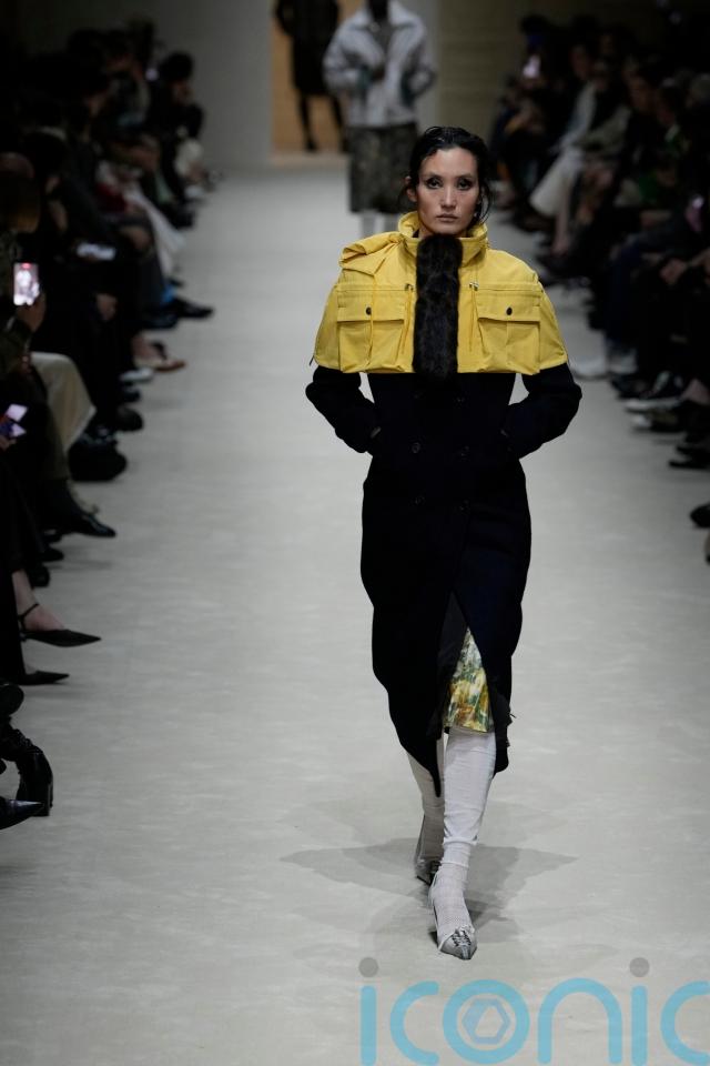 Elsewhere, a grey utility jacket was thrown over a floral knee-length skirt with an evening clutch, reinforcing Prada’s ongoing fascination with the tension between refinement and functionality.