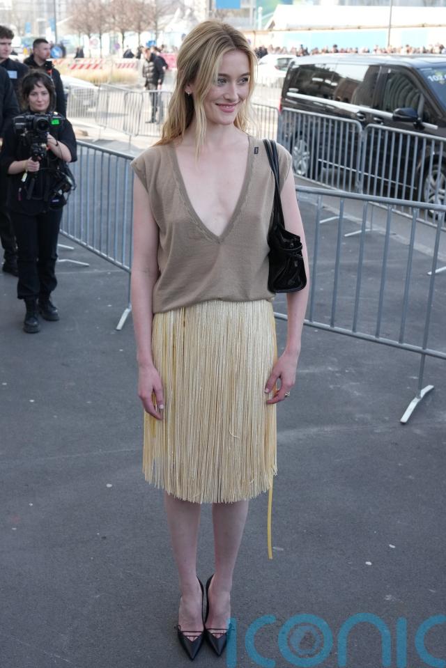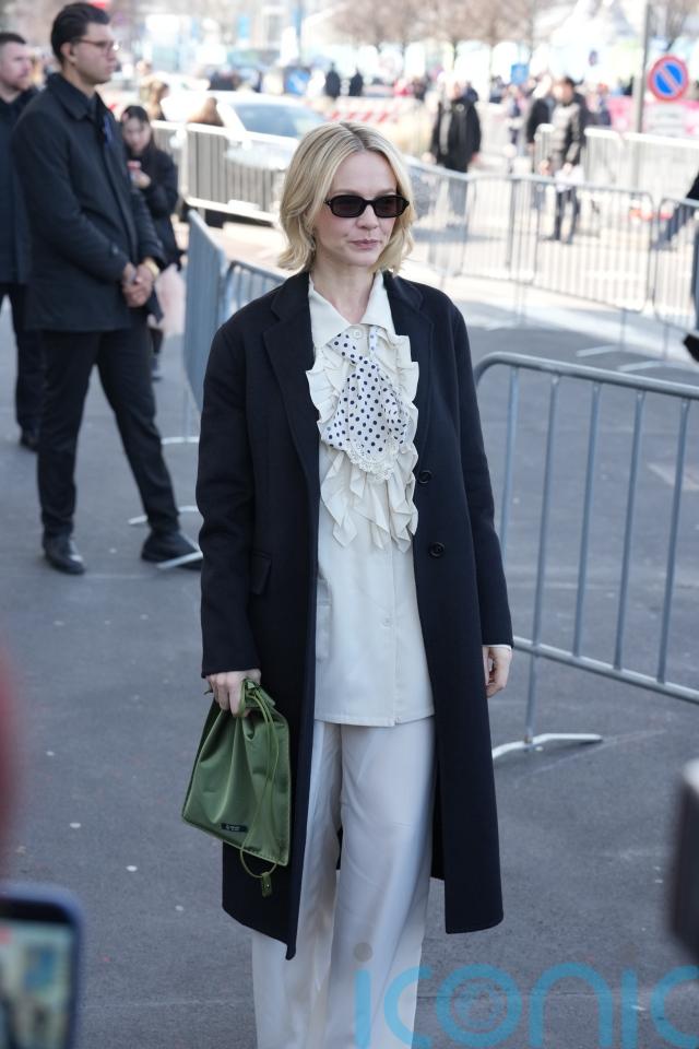 While Hadid was walking on the runway, stars were also sitting front row, including actress Carey Mulligan, 40, an ambassador of the label – who recently wore a fluid satin navy blue slip dress on the BAFTA red carpet – wearing a cream ruffled blouse and polka dot cravat with a black overcoat.