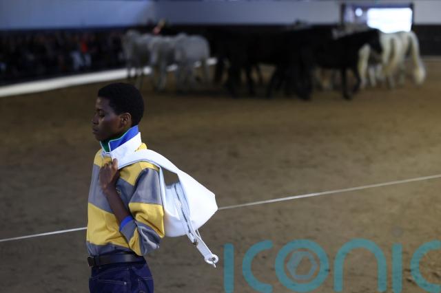 At the beginning of the show, several horses were released into the centre of the arena, moving calmly around the space as models continued walking the runway creating a dynamic energy within the presentation.