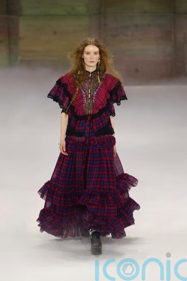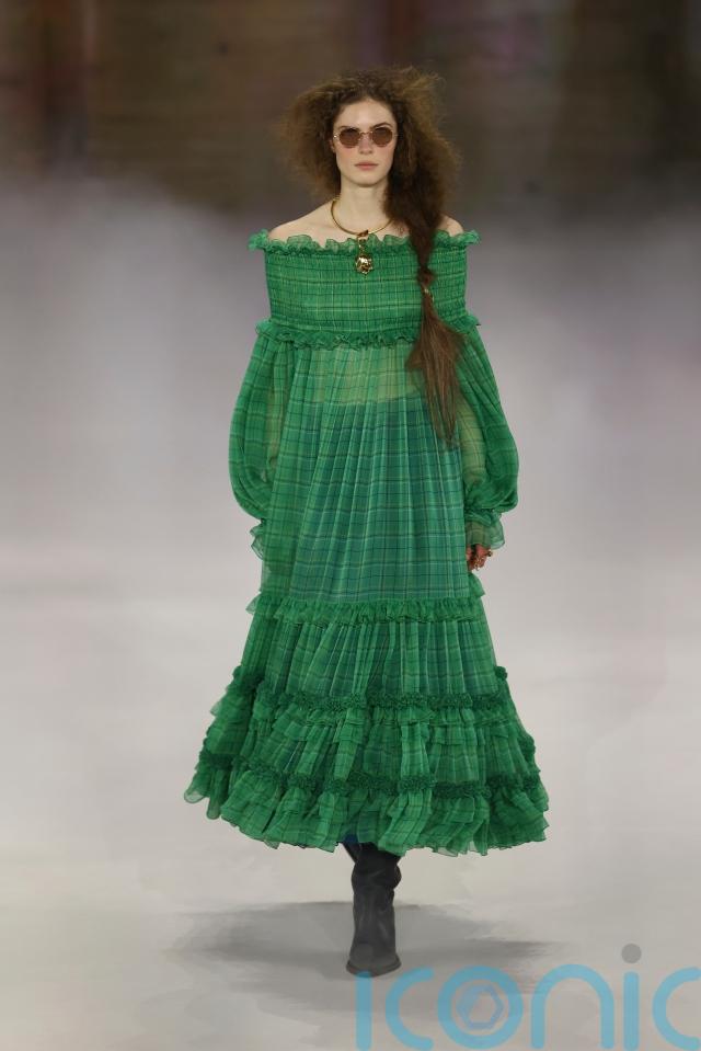 Elsewhere, an emerald green plaid dress captured the essence of Chloé’s romantic identity. Featuring an off-the-shoulder design, the dress had smocked detailing and voluminous sleeves, while tiered ruffles built volume throughout the skirt.